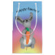 Toy rabbit with orange carrot in foreground. Background is soft rainbow colours. Curved text above reads "Happy Easter!"