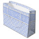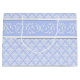 Original damask is actually a type of fabric which uses various weaving techniques and various threads to create alternating sheens resulting in a tone-on-tone design. In original damask, the pattern was actually woven into the fabric, making the fabric reversible. A more modern adaptation would be the fabrics created on Jacquard looms. These machined damasks were less expensive and succeeded in bringing this more affordable damask to the middle class. This design is a salute to that thousand-year-old art of damask weaving. The white flourish is a crisp contrast to the wedgwood-esque blue backdrop. This lovely overall design is beautifully anchored with a slightly dimensionalized flourish crowning border. It is an excellent choice for weddings, anniversaries, baby showers . . . virtually any elegant occasion.