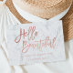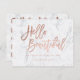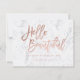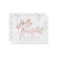 A modern, stylish gift certificate hello beautiful business card with modern hand lettering style brush typography in faux rose gold foil on a trendy and elegant white marble background. If you need any customization, don't hesitate in contacting me