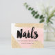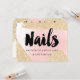 A modern, stylish gift certificate beauty nail technician business card with modern hand lettering style brush typography on a trendy and elegant luxurious gold glitter sparkles brushstrokes and pastel pink watercolor.