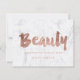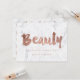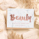 A modern, stylish gift certificate beauty artist business card with modern hand lettering style brush typography in faux rose gold foil on a trendy and elegant white marble background.