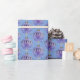 Tree ornament in tiled pattern. Purple and blue round globe with golden hook for hanging on a tree. Shown in a staggered tile pattern on a light blue background. Writing on ball reads "Peace on Earth"