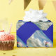 Hot air balloon in rainbow colours, floating among white, fluffy clouds. Image is angles and looks like a postcard affixed to the paper with angle corners (i.e. corners are cut off). Dark blue background is basis of wrapping paper colour.