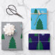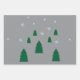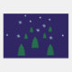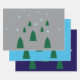Pine trees in two sizes (3 large, 4 smaller in background). Green trees have blue snowflakes falling in sky above. Background colour is dark grey on one sheet, light blue on the second and dark blue on the third.
