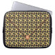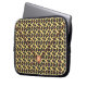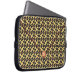 The original artwork by ZoeSPEAK on this 10” Laptop Sleeve is a pattern made in the style of an envelope clutch bag. The bag is a gilded latticework cage, lined with a dark blue black silky fabric which has a subtle pattern of circular lines and highlights in blue, red and green. There are tiny red balls in the open spaces of the latticework. The flap of the envelope has a red border, and a large red ball button closure under gold latticework.