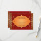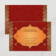 Faux golden edges make a gilded border for this Indian inspired wedding reply card. The background is a deep red with a subtle pattern overprinting it all to enhance an ornate frame containing customized response text. The frame is surrounded by four small golden paisley ornaments. Available with matching products.