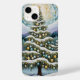 This majestic artwork portrays a beautifully decorated Christmas tree set against a serene, snow-covered mountain landscape. The tree is laden with snow and adorned with glowing golden and pastel blue ornaments. The background features stylized, snow-capped mountains and a dense forest, all rendered in a harmonious palette of cool blues, purples, and greens. A radiant sun or starburst crowns the scene in a brilliant, mosaic-like pattern of gold and white, giving the piece a rich, decorative, and spiritual quality.
