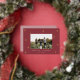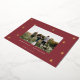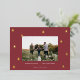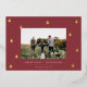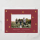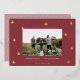 A modern and elegant Christmas holiday card design featuring a horizontal photo on a cranberry red background dotted with gold foil pine trees. Personalize with your custom holiday greeting, family name and the year beneath.