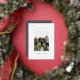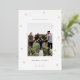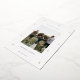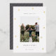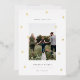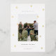 A modern and elegant Christmas holiday card design featuring a single vertical photo on a white background dotted with gold foil pine trees. Personalize with your custom holiday greeting, family name and the year beneath.