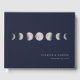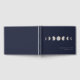 Elegant watercolor gilded moon phases, modern wedding guest book. Book features template text lines for names, event title and date. background colours shown in navy blue.