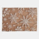 This delicate composition celebrates the intricate beauty of nature through a series of highly detailed snowflakes set against a warm, sandy ocher background. Each snowflake is rendered with fine, lace-like precision in a crisp white, creating a striking contrast that emphasizes their unique hexagonal symmetry. The background features a subtle, speckled texture reminiscent of falling frost or a light dusting of snow, while the overall warm tone lends a sophisticated, vintage holiday esthetic to the piece. The arrangement is organic yet balanced, capturing a frozen moment of winter elegance.