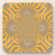 This artwork features a central, ornate mandala-like design in metallic gold and grey. Four stylized, symmetrical elements, also in metallic tones, surround the centre. The background is composed of radiating bands of vibrant golden yellow alternating with textured grey, creating a distinct zebra-stripe visual. Four smaller, detailed square motifs are positioned in each corner, echoing the central theme.
