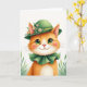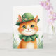 This card shows a ginger cat facing you head-on, dressed in a deep green bowler hat trimmed with small white daisies and fresh leaves, with a ruffled green collar resting under its chin 💚. Set against a bright white background with soft light, the cat’s steady gaze feels like a friendly, affectionate hello that lingers a moment longer than expected. Its large emerald eyes catch tiny points of light, and the faint rosy blush on its cheeks pairs with a pink nose to give it a tender, almost bashful look. The orange fur is richly textured and warms into a creamy white chest, while long, fine whiskers sweep outward in neat arcs. A short greeting sits near the top in green lettering, with a smaller line placed below the portrait in a matching shade ☘️. The overall layout keeps the cat centered and close, as if it has stepped forward for a gentle St. Patrick’s Day exchange. Small sprigs of green foliage peek in from the lower corners, framing the portrait against the open white space.