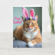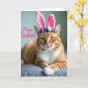 This card features a ginger tabby cat facing forward with golden-green eyes that seem to meet yours with a friendly, almost flirty focus 🐇. Soft pink bunny ears sit on its head, and a small flower crown of white and purple blooms with green leaves adds a gentle, springtime touch 🌷. The cat rests on a muted grey fabric surface with its front paws crossed, giving the pose a calm, companionable look like it’s waiting beside someone it likes. Warm, soft lighting brings out the orange coat and darker stripes while brightening the white chest and fine whiskers. In the background, the scene fades into a smooth blur so the cat stays clearly in the spotlight. A cheerful line of pink text is placed over the image, standing out against the softer tones without covering the cat’s face. The bunny ears are a light pastel pink with a slightly deeper pink inner section, and the flower crown sits centred just behind them.