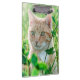 Photograph of a ginger cat with pale green eyes sat in long green grass.