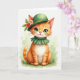 This design shows an anthropomorphic ginger kitten centered in the scene, looking straight ahead with luminous emerald-green eyes that feel like they’re holding a tender gaze for someone special 💚. It wears a forest-green bowler hat decorated with small red and peach flowers tucked among green leaves, echoing the kitten’s eye color. A matching ruffled collar circles its neck, giving it a dressed-up look that reads like a friendly date or a sweet meeting in the park. The fur is orange and white with soft striping, and the tiny pink nose and faint smile add a gentle, affectionate expression. The background is a light green wash that suggests a quiet meadow, with a few tiny white blossoms and thin blades of grass scattered around. St. Patrick’s Day text sits near the top in green lettering, with a smaller line below in a softer green, and a little ☘️ accent nearby. Light green tones spread outward behind the kitten, with delicate white flowers dotting the lower area like confetti across the grass.