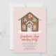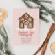 This festive pink invitation showcases a large watercolor/gouache gingerbread house decorated with white icing and green and red peppermints with snow flurries surrounding the house. On the back of the card you will find a watercolor pink and red stripe pattern. The card also features vintage typography for the party details and a fun whimsical script for the event title in red.