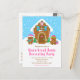 This cute and festive invitation features a cute gingerbread house decorated with pink and green candy. Beside it are adorable gingerbread men with gifts, dressed in Santa hats and a scarf. In the background is a bright blue winter sky with elegant falling snowflakes. The text combines decorative and sans serif fonts for a stylish and modern look. This is perfect for a gingerbread house decorating party.