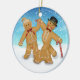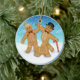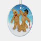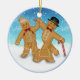 Fun trio features a round ornament with a gingerbread girl, boy and gingerbread dog on a leash. The background is a winter scene with snow covered ground and snowflakes. Other version available with customizable back text and date..