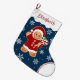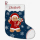 Sweeten up your holiday décor with this charming gingerbread girl Christmas stocking! Featuring a gingerbread cookie girl dressed in a red hooded dress with white trim, holding two peppermint lollipops, this design is full of festive personality. Surrounded by snowflakes on a blue background, this stocking is perfect for children, families, and gingerbread lovers. Add a name for a personalized touch that makes Christmas morning even more special.