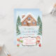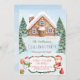 A festive holiday Christmas party invitation. A snowman, Santa clause and gingerbread house are seen in a winter snow scene forest surrounded by Christmas trees and lights.