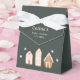 Modern Christmas theme baby shower favour box featuring illustration of gingerbread houses with pink accents.