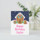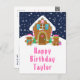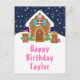 This cute and festive birthday postcard can be personalized with a name or title such as daughter, granddaughter, niece, friend etc. The design features a cute gingerbread house decorated with pink and green Christmas candy. Beside it are adorable gingerbread men with gifts, dressed in Santa hats and a scarf. In the background is a navy blue winter sky with elegant falling snowflakes. The text is in a bold and festive font. This is perfect for Christmas and the winter holiday.