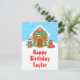 This cute and festive birthday postcard can be personalized with a name or title such as son, grandson, nephew, friend etc. The design features a cute gingerbread house decorated with red and green Christmas candy. Beside it are adorable gingerbread men with gifts, dressed in Santa hats and a scarf. In the background is a bright blue winter sky with elegant falling snowflakes. The text is in a bold and festive font. This is perfect for Christmas and the winter holiday.