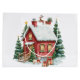 An elegant winter design with a gingerbread house, flying reindeer, fir trees with stars and gifts.