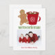A Christmas photo invite featuring an illustration of a gingerbread man standing to the left of a red mug with snowflake. Mug is filled with hot chocolate topped with three marshmallows. Personalize with your family's photo and name.