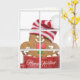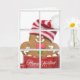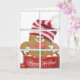 Christmas gingerbread man in red mug in windowpane with snowflakes for Happy Holidays