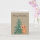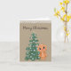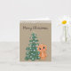 Gingerbread Man with Blue and Green Tree Card. Cute gingerbread person with the biggest eyes and smile, standing beside a blue and green decorated Christmas tree. Edit the greeting and family names to your own choices. If desired, you can change the background colour to match your holiday decor and style.