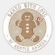 Here's a happy little gingerbread man with little heart 'buttons’ on his shirt and a warm red heart in his hand on a backdrop of dainty iced gingerbread snowflakes. Enjoy the Season! Add your own message or personalize with your name and address to use as an envelope seal! Great for bakers or as a little gift for your favourite baker, or for anyone who loves gingerbread!