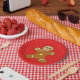 Illustrated gingerbread man with red and yellow gumdrop buttons.