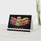Adorable Christmas greeting card, with a photo of home made gingerbread men all decorated in bright colors. A black background really makes these delicious looking cookies stand out. A white rick rack looking ribbon and red text reading, Merry Christmas, at the bottom is fully customizable to say anything you wish, as is the greeting inside.
