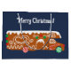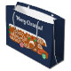 This gift bag is ready to be customized with your own message and features a festive illustration of a gingerbread RV. This cookie class C camper is decorated with white icing and red and green Christmas candy. The graphic is set against a navy blue background with your custom text above in white lettering.