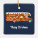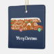 The front of this Christmas ornament features an illustration of a gingerbread camper. The festive cookie RV is decorated with white icing and red and green candy and set against a navy blue background. The "Merry Christmas" message below the graphic can be personalized with your own text. The reverse side of the ornament is ready to be customized with your own photo, perfect for sharing a vacation memory.