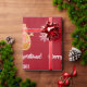 Modern Christmas gift wrap for kids, with an elegant design that includes a gingerbread snowman, Xmas tree, and Santa, snowflakes, the greeting "Merry Christmas" in stylish typography, and a personalized name. On a red background.