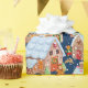 A fun and colourful village of gingerbread houses covered in snow (blue background)