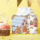 A fun and colorful village of gingerbread houses covered in snow (white background)