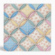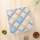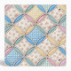 A seamless background featuring pastel gingham patterns and floral prints in a cathedral window quilt design.