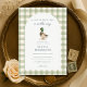 Gingham mallard duck bow sage green baby shower invitation featuring a charming duck illustration with soft sage green gingham accents and a sweet bow detail. Perfect for a gender neutral or boy baby shower with a rustic, countryside feel. Ideal for spring celebrations, outdoor gatherings, and classic nursery themes. Editable text for easy personalization. Print-ready layout.