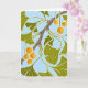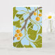 Arts & Crafts "Ginkgo Dance" Design Blank Greeting Card. This block print style design features green Ginkgo leaves waving or 'dancing' in a summer breeze against a blue sky background with orange and yellow marbled fruits suspended by slender green hanging branches.