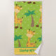 Take your children on an adventure with this cute giraffe themed beach towel. Using a green polka dot backdrop there is a giraffe and palm tree pattern that fills the design. At the bottom is a green and light brown box from inserting a name. Personalize your giraffe themed beach towel today!