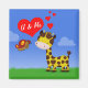 A cute and colourful illustration with a giraffe and a butterfly with red hearts.