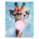 Giraffe wearing glasses and blowing a pink bubble gum blue mottled background.