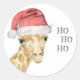 Cute Christmas sticker with a funny giraffe in a red Santa hat. Text says, "Ho, Ho, Ho"