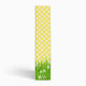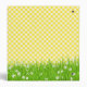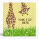 Cute giraffe in grass with daisy in its mouth on a yellow and white gingham background.