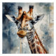 A Giraffe with detailed watercolor with expressive eyes is portrayed against a soft, blurred background. The natural colours enhance the lifelike appearance.