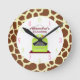 A clock featuring an illustration of a green stove at centre. Background is giraffe print pattern. Numerals are pink and green. Personalize with your name.
